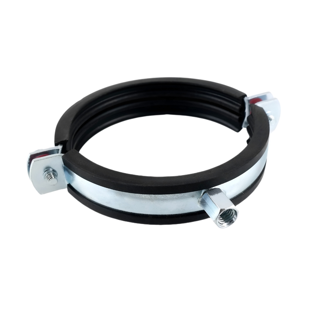 Diese Rohrschelle aus verzinktem Stahl mit Gummieinlage ist die ideale Lösung zur sicheren und vibrationsarmen Befestigung von Rohrleitungen.