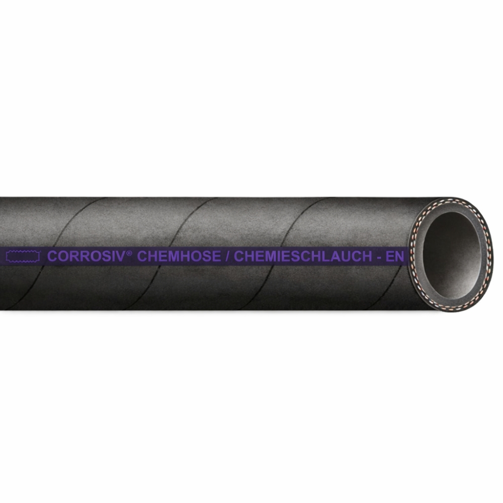 Aufdruck: Corrosiv® Chemhose / Chemieschlauch – EN 12115 – EPDM – D – ID mm – WP 16 bar – Ω/T TRbF 131/T2 § 5.5 – Quartal/Jahr