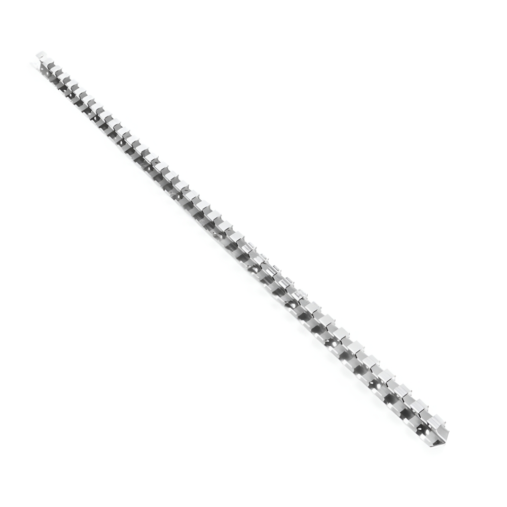 Diese Hakenleiste aus Edelstahl mit 984 mm Länge dient zur sicheren und stabilen Befestigung von PVC-Streifenvorhängen in Industrie- und Gewerbebereichen.